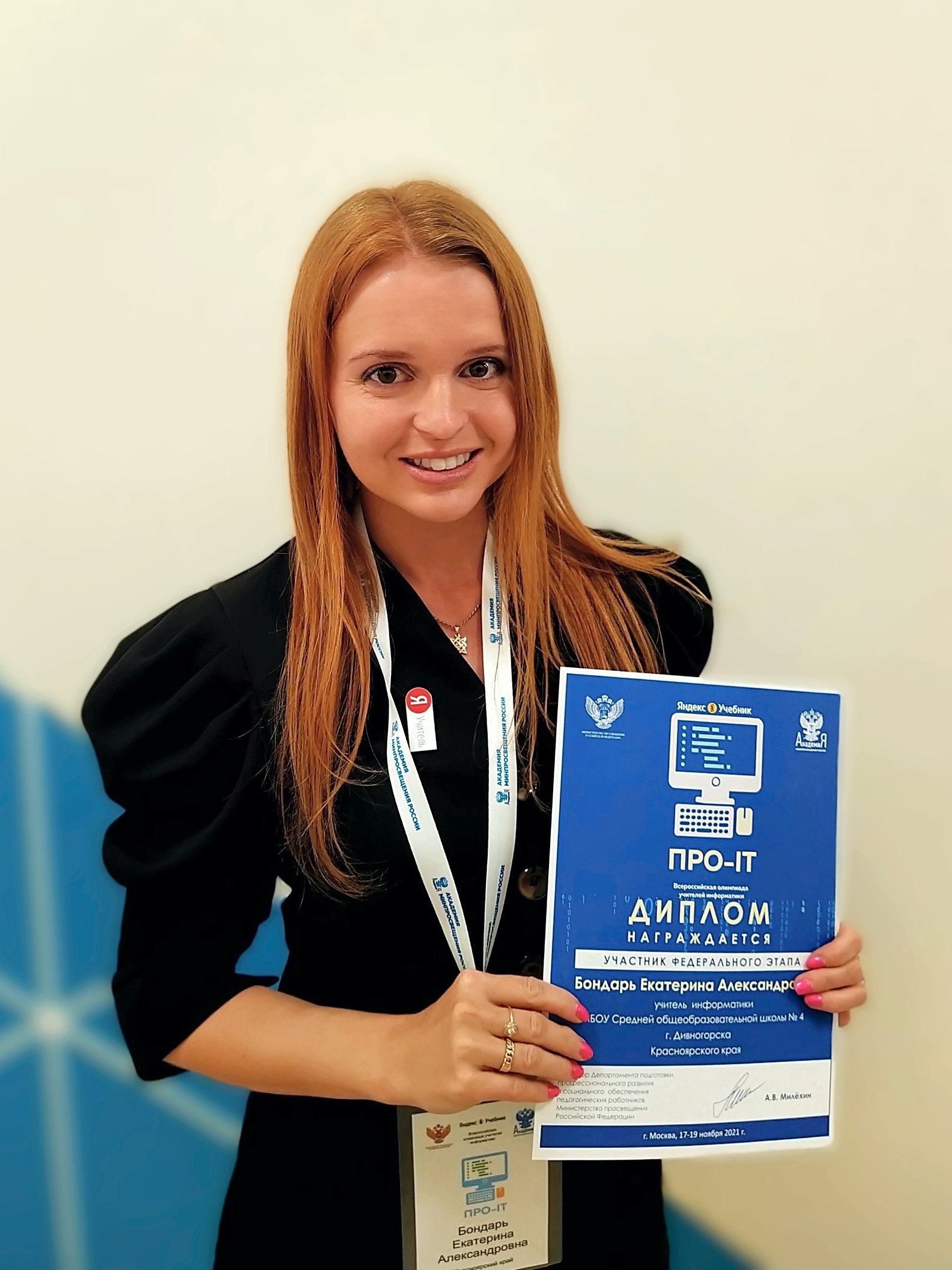 - Являлась спикером вебинара «Как педагогам подготовиться к олимпиаде «ОлимпиаДА» в рамках цикла мероприятий ЦНППМПР «ПрофСреда» - Получила первую квалификационную категорию по должности «Учитель» - Выступила на региональном этапе Всероссийского фестиваля лучших практик технической направленности с докладом «Организация курса "Робототехника" в рамках проекта "Энергия в каждой капле"» в технопарке «Кванториум» - Под моим руководством обучающийся 10 класса Игнатов Антон разработал проект «Использование Telegram-ботов в школьной жизни», который был удостоен диплома I степени в городском этапе научно-практической конференции «Научно-технический потенциал Сибири» и II степени в XVI Решетневских чтениях (СибГУ им М.Ф. Решетнёва) - Приняла участие совместно с обучающимся курса «Робототехника» Вычужаниным Дмитрием в образовательном лагере на озере Байкал «Энергия в каждой капле» (организатор – Эн+). В рамках лагеря в соревнованиях в дисциплине «Игра роботов» Дмитрий занял I место. - Собрала команду для участия во Всероссийской метапредметной олимпиаде учителей «Команда большой страны», где наша команда одержала победу на региональном этапе и стала участником федерального этапа в г. Москва. - Являюсь экспертом проверки заданий с развернутым ответом на ОГЭ по предмету Информатика и ИКТ. - Курсы повышения квалификации «Технологии работы с неуспевающими и одаренными обучающимися 5-11 классов» (72 ч.), «Инклюзивное образование в основной и средней школе» (72 ч.), «Правила оказания первой помощи пострадавшим» (16 ч.), «Формирование инженерных компетенций у школьников в рамках проектной деятельности образовательного проекта «Энергия в каждой капле» (72 ч.)